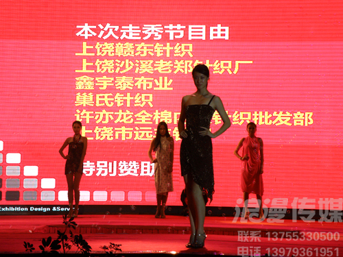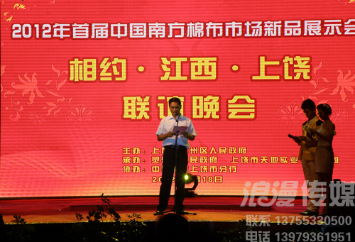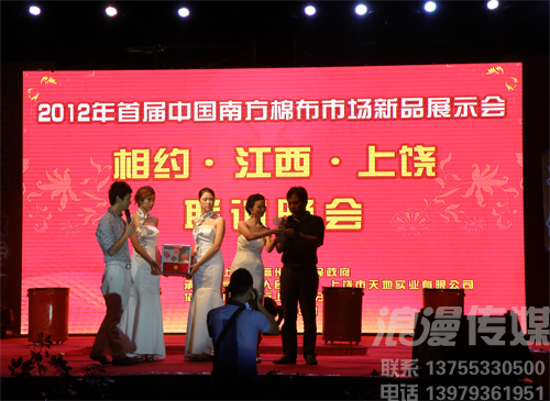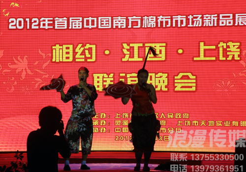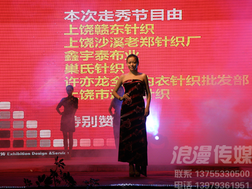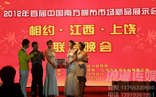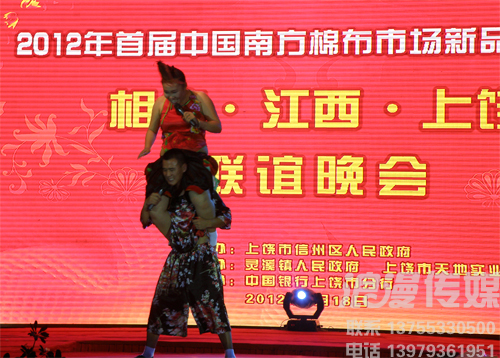 地點:上饒丁家洲南方棉布批發(fā)市場 時間:2012.8.18日晚 8月18日晚,隨著一曲動感的韓國風舞蹈,中國南方棉布市場的新品展示會揭開了帷幕。中國南方棉布市場項目負責人、天地實業(yè)董事長陳培兵對市場的發(fā)展前景表達了堅定的信念,此次展示會更是得到了各級領導的重視。在浪漫傳媒精心的策劃之下,整場展示會現(xiàn)場精彩紛呈,高潮迭起,晚會不惜重金請來了2008年“中國紅歌會”全國總冠軍——徐丹、2010年網絡紅人劉浩楠,還有難得一見的川劇變臉,東北二人轉、雜技、蛇舞等等,引來觀眾不斷的掌聲喝彩聲,舞臺使用了大型LED屏幕及各種燈光、音響采用演唱會專用線陣音響,給人以超震撼的視聽享受。 網絡紅人劉浩楠 網絡紅人劉浩楠 網絡紅人劉浩楠 棉布時裝SHOW 棉布時裝SHOW 棉布時裝SHOW 2008年“中國紅歌會”全國總冠軍——徐丹 2008年“中國紅歌會”全國總冠軍——徐丹 2008年“中國紅歌會”全國總冠軍——徐丹